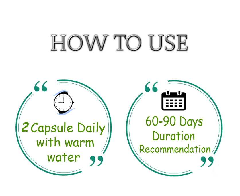 1 कैप्सूल सुबह नाश्ते के बाद पानी से लें और 1 कैप्सूल रात्रि भोजन के बाद पानी से लें।